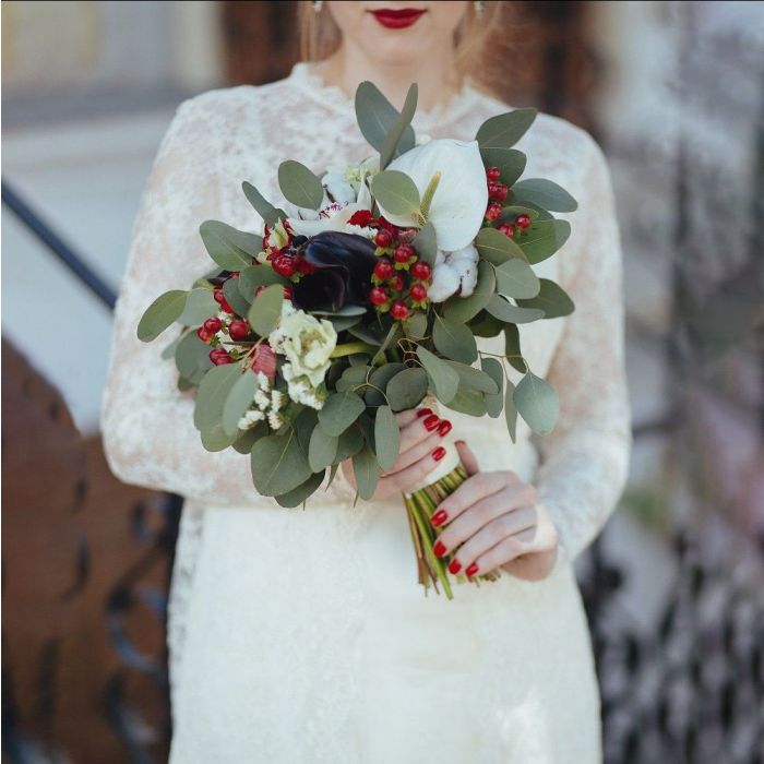 орхидея (цветок) - 3 шт.; хлопок бутон - 3 шт.; антуриум - 1 шт.; статица - 5 шт.; гиперикум - 10 шт.; кала - 5 шт.; альстромерия - 6 шт.; эвкалипт