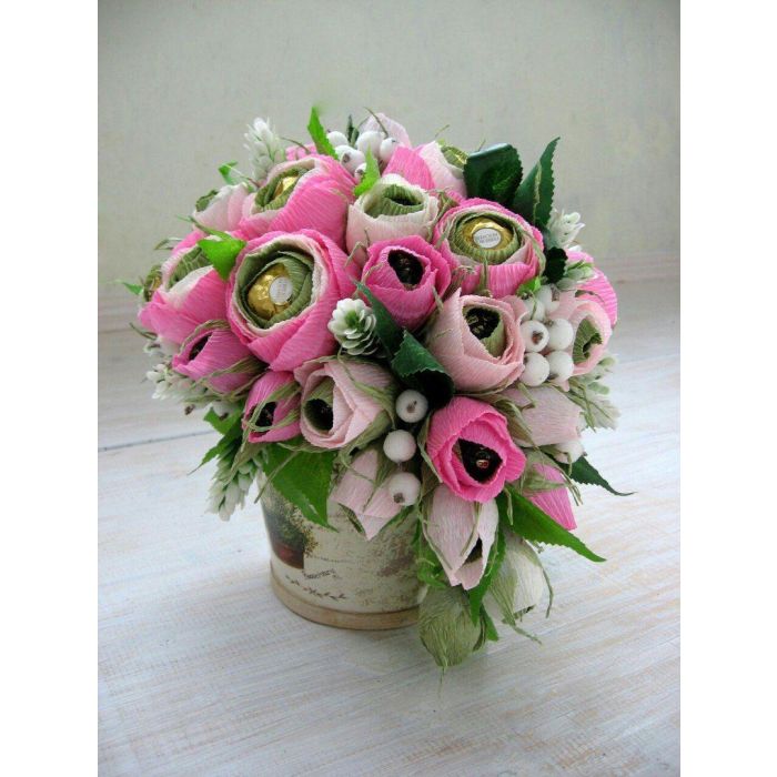 Вид конфет для букетов может быть выбран вами индивидуально, по согласованию с нашими sweet-дизайнерами, стоимость букета при этом может измениться.