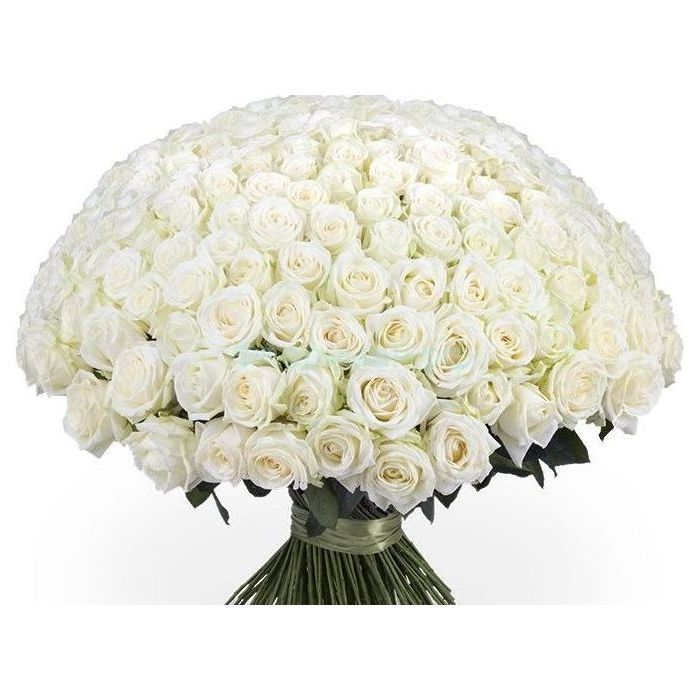 Розкішний букет із двох сотень білосніжних рожевих бутонів підкорить будь-яке жіноче серце. Така композиція квітка об'ємна, виглядає дуже ефектно. Її можна подарувати під час романтичного визнання з нагоди свята на будь-яку урочистість. Білі троянди – доречний подарунок на весілля. Їх також можна подарувати під час пропозиції руки та серця, на заручини, річницю знайомства або пам'ятну для двох дату.