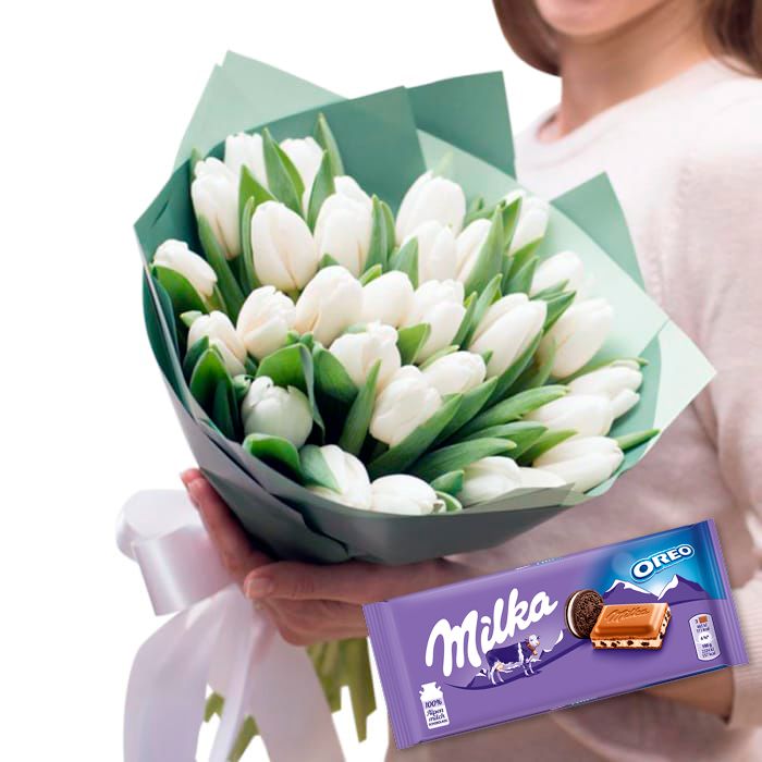 Букет з 25 білих тюльпанів та шоколадки Milka