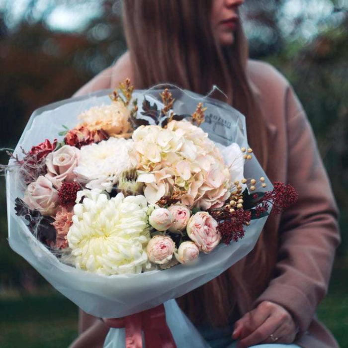 протея - 1 шт., роза - 2 шт., роза кустовая пионовидная - 1 шт., гортензия - 1 шт., эустома - 1 шт., хризантема белая кустовая - 1 шт., хризантема белая одноголовая - 1 шт., гвоздика - 3 шт., скимия 2 шт., леукодендрон, декоративная зелень, упаковка.