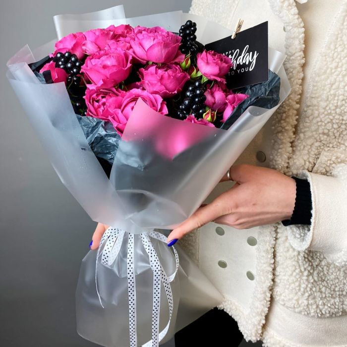 пионовидные кустовые розы - 5 шт.; декоративные ягоды лигуструм или гиперикум - 3 шт.