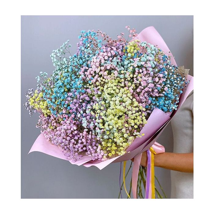 Райдужня гіпсофіла для тих, хто полюбляє життя в усьому різноманітті його кольорів. Ідеальний букет для яскравих особистостей та невиправних життєлюбів.