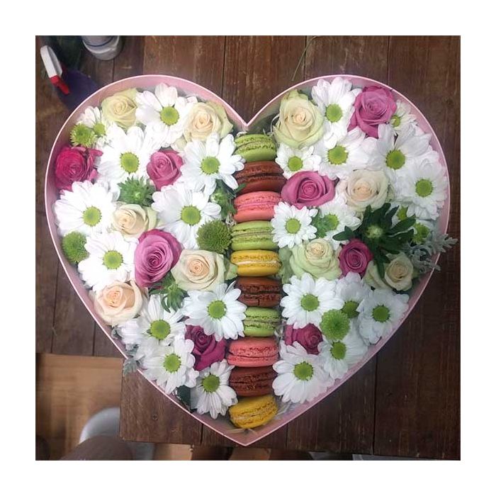 Коробка з квітами та макарунами "Дві половинки"