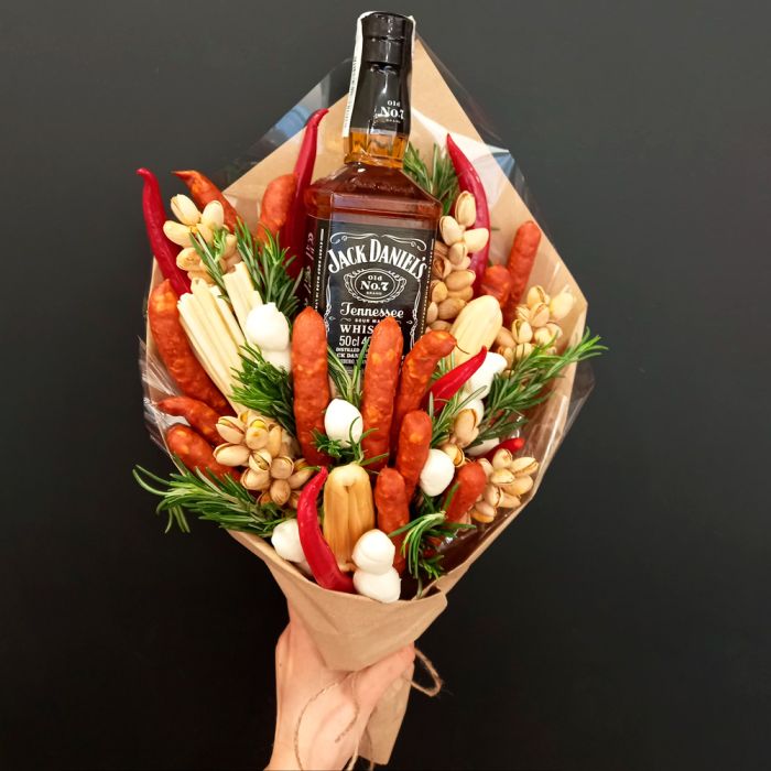 виски Jack Danial's - 0.5 л; сыр сулугуни - 2 шт.; фисташки - 100 г; колбаски охотничьи - 300 г; перец чили - 6 шт.; сыр рассольный; розмарин