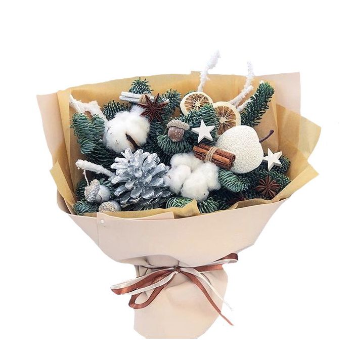 Шукаєте подарунок чи сувенір до Нового року? Подайте друзям чи колегам, сусідам, батькам, родичам чи коханій оригінальний зимовий букет! Він зібраний не з квітів, а з гілок, доповнений спеціями та незвичайним декором. Такий подарунок наповнить будинок ароматом свята, в якому переплітаються свіжі хвойні ноти з тонким цитрусовим запахом апельсина та затишною насолодою кориці.
