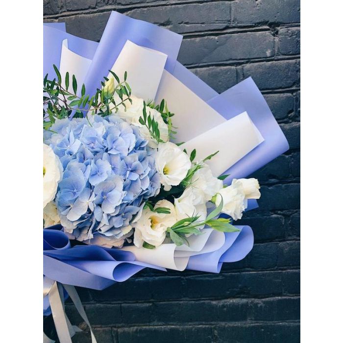 гортензия - 1шт, эустомы - 2 шт, зелень