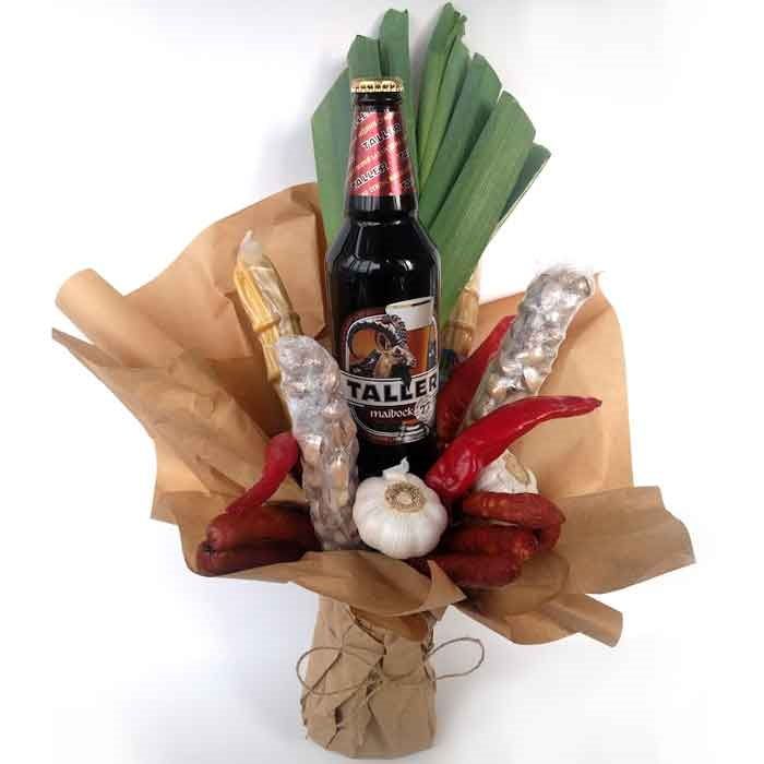 пиво Taller - 1 бут., фисташки, колбаски охотничьи, сулугуни, чеснок, лук порей, оформление.