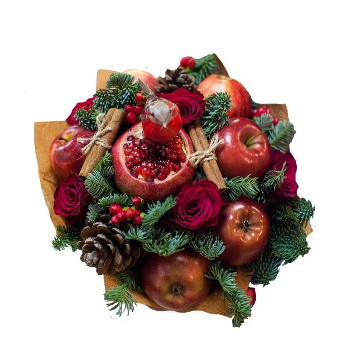 У новорічному букеті з трояндами «Гранат та кориця» елегантні бордові бутони квітів доповнені соковитими фруктами та справжніми зимовими спеціями. Поєднання свіжого гранату та паличок кориці виглядає незвичайно, налаштовує на святковий лад. Яскраві яблука та свіжі ялинові гілки надають композиції насиченого кольору, наповнюють повітря ароматом свята. Букет оформлений в екостилі. Упаковка – крафтовий папір.