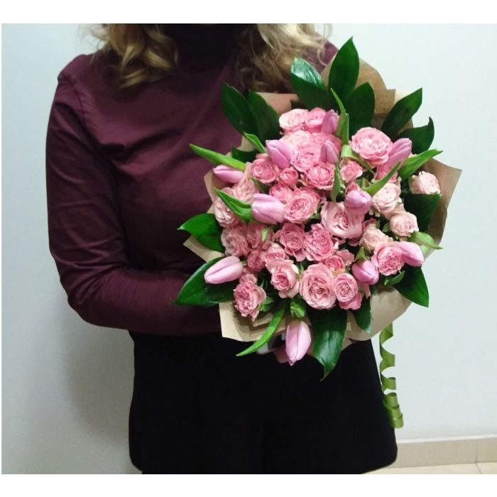 Ніжне та витончене поєднання рожевої кущової троянди сорту "Грація" та голландських тюльпанів подарувало чудовий букет "Вишуканість" для всіх наших клієнтів. Висота букета невелика, всього близько 40 см, але завдяки пишності кущової троянди, додаванню зелені та спеціальної упаковки, він виглядає об'ємно і дуже дорого. Отримати такий букет гідна кожна жінка!