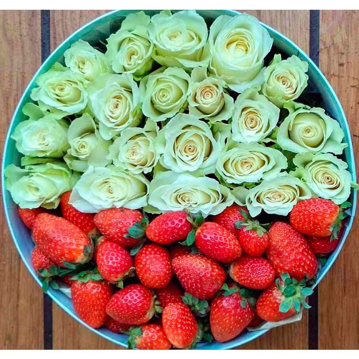 Коробка з квітами та фруктами - це чудовий гармонійний подарунок у теплу пору року. Однак компанія Розарій дозволяє продовжити літо практично на 365 днів на рік, видобуючи для своїх клієнтів і троянди, і полуницю в будь-яку пору року. Коробка з трояндами та полуницею акуратно формується і закривається, так що одержувачка подарунка до останньої секунди не знатиме який саме подарунок вручає їй кур'єр.