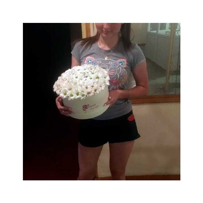 Коробка із хризантемами білого кольору, перев'язана гарним бантом, гарантовано запам'ятається тому, хто отримає такий презент. Зробити сюрприз можна як на День Народження, так і на День усіх закоханих або будь-яке інше свято. Композиція із хризантем – це універсальний варіант для подарунка, а модне оформлення кольорів у коробці робить їх ще більш привабливими.