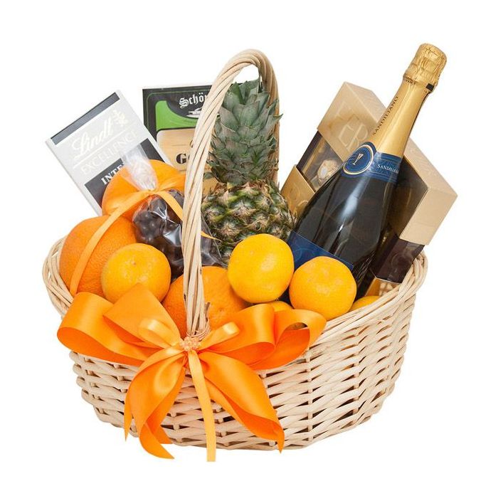 Святкові кошики з фруктами, солодощами та делікатесами – це цікава альтернатива букету квітів. Вони виглядають розкішно та елегантно, а смачне наповнення робить такий сюрприз не лише красивим, а й корисним. Піднести подарунковий кошик можна друзям чи батькам, сусідам: на ювілей, новосілля, інші свята. Вітамінні ласощі та вишукані солодощі завжди доречні, це універсальний презент. Пляшка ігристого вина доповнює композицію.