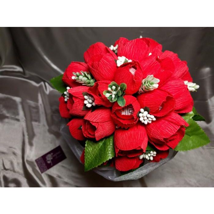 Такой яркий букет из конфет – идеальный подарок, ведь его можно преподнести и женщине, и мужчины. Кроме того, сладкую композицию ручной работы можно презентовать на любой праздник: на День Рождения, свадьбу, 8 Марта, День учителя. Оригинальный подарок будет не только радовать глаз, а и станет вкусным дополнением к вечернему чаю.