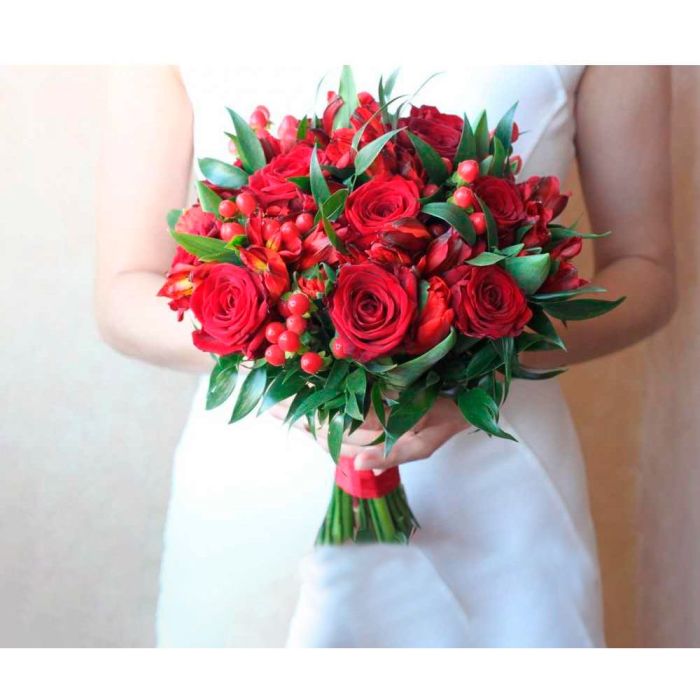 роза - 15 шт.: альстромерия - 10 шт.; гиперикум - 7 шт.; рускус или эвкалипт.