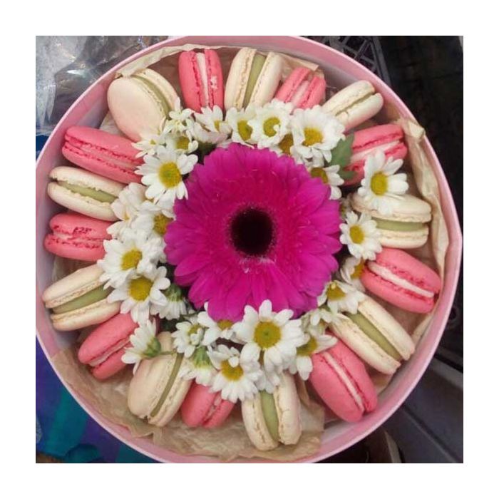 Коробка з герберами, хризантемами та макарунами "Промінь"