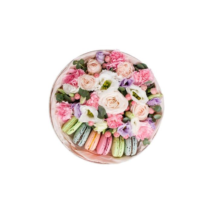 Коробка з макарунами, трояндами, еустомами та гвоздиками "Марго"
