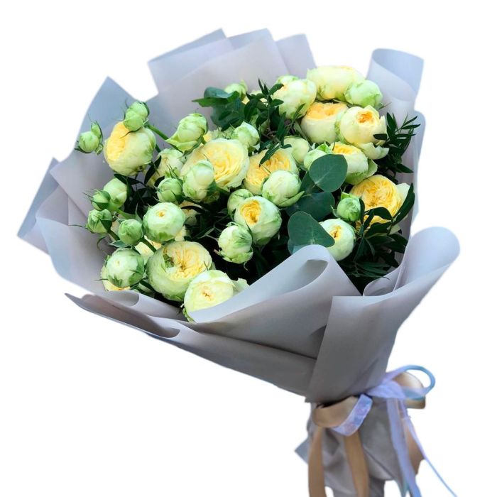 пионовидные кустовые розы - 9 веток, эвкалипт, зелень
