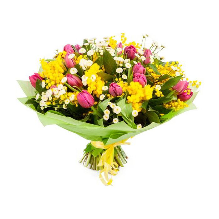 тюльпаны - 21 шт., хризантема - 4 шт., мимоза, упаковка.
