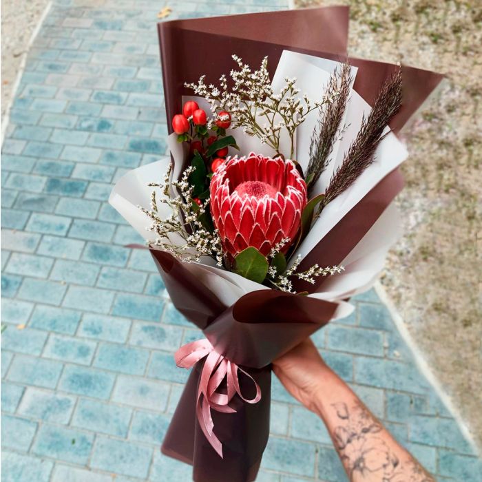 протея - 1 шт.; гиперикум - 1 шт.; зелень и сухоцветы.