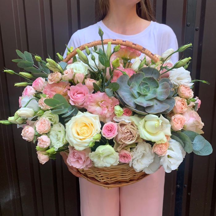 эустома - 10 шт.; сукулент - 1 шт.; роза - 11 шт.; кустовая роза - 15 шт.; эвкалипт, корзина.