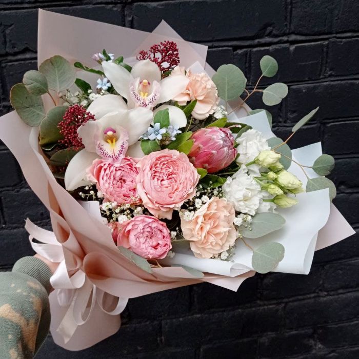 Букет для тих, хто хоче щось більш екзотичне. Тропічні орхідеї, протеї та півоноподібні троянди чудово поєднуються між собою, а ніжні квіти другого порядку, такі як діантус та еустома, ідеально доповнюють цю композицію.