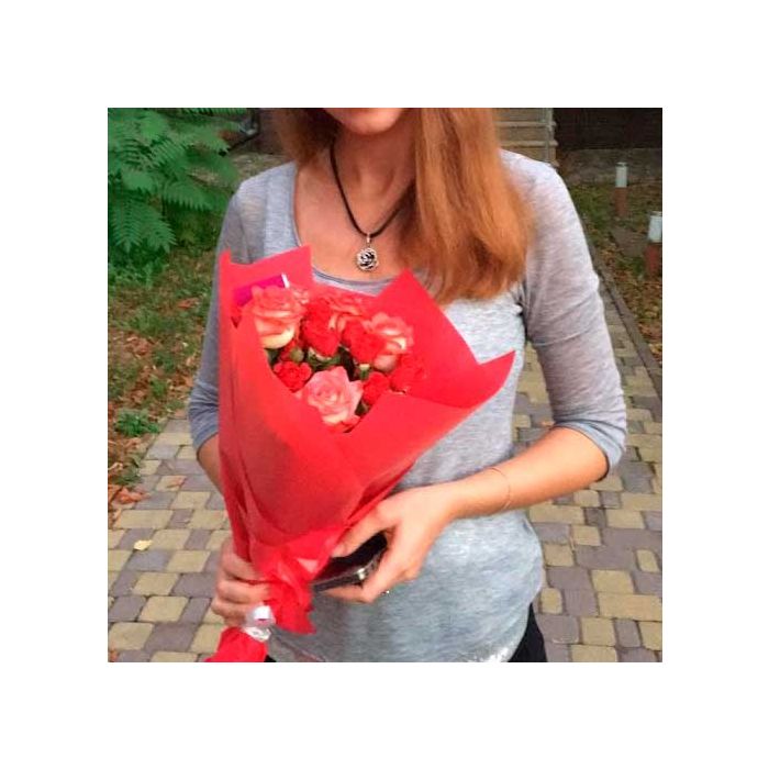 Опис / Букет з кущових та класичних троянд "Світанок"