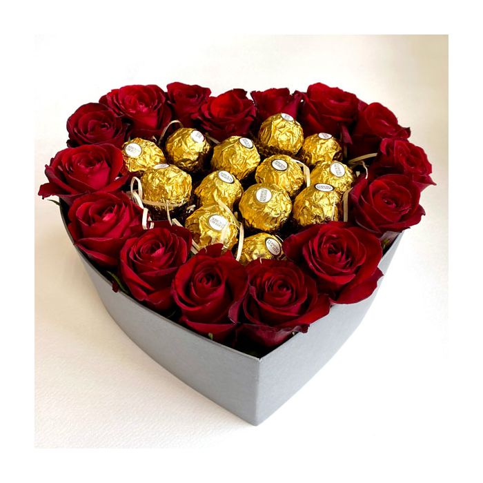 Квіти та вишукані солодощі – це набір, який допоможе підкорити жіноче серце. Наші флористи створили композицію для тих, хто шукає спосіб привернути увагу неприступної красуні чи хоче розповісти про ніжні почуття. Повітряні цукерки «Рафаелло» або витончені шоколадні Ferrero Rocher у складі серця з 15 яскраво-червоних троянд розкажуть про те, що для неї ви готові на все. Ця композиція поєднує пристрасть та яскраві емоції, про які говорять троянди, з ніжністю, захопленням, бажанням дбати. Це незвичайний подарунок, який запам'ятається надовго, створить романтичний настрій, стане приємним сюрпризом. Його можна замовити для особливого вечора: заручин, освідчення в коханні. Композиція упакована в коробку, усередині знаходиться флористичний оазис, тому троянди надовго збережуть свіжість.
