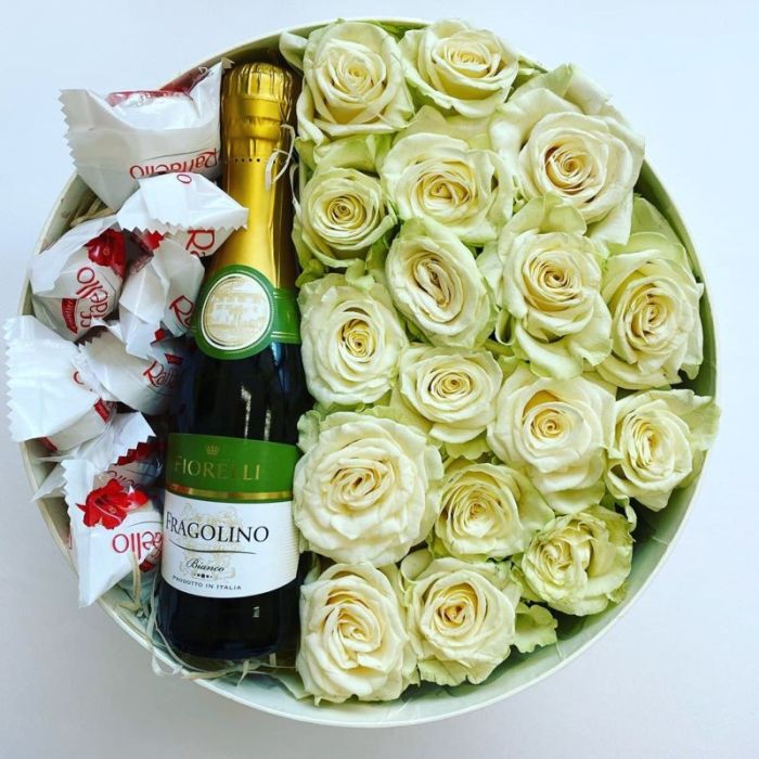 роза - 15 шт., шампанское белое 0.2 л, конфеты Raffaello или Ferrero Rocher, флористические материалы, коробка.