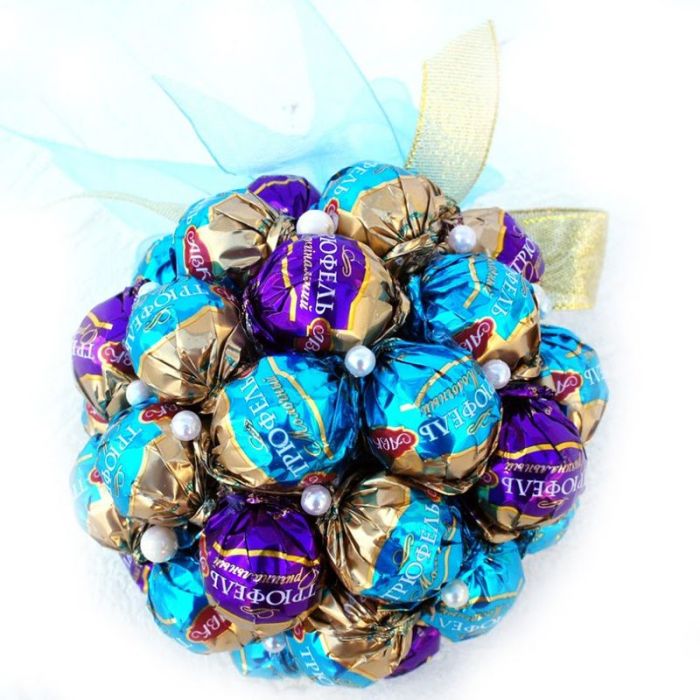 Свит-дизайн все больше набирает обороты и становится популярным среди тех, кто ищет оригинальные подарки для близких. Мы предлагаем удивительный букет из конфет, который очень похож на красочную новогоднюю игрушку. Композиция "Шарик на елку" состоит из 35 вкуснейших шоколадных трюфелей и декоративных материалов. Если вы находитесь в поисках красивого и необычного подарка на Новый год, этот конфетный букет станет лучшим выбором.