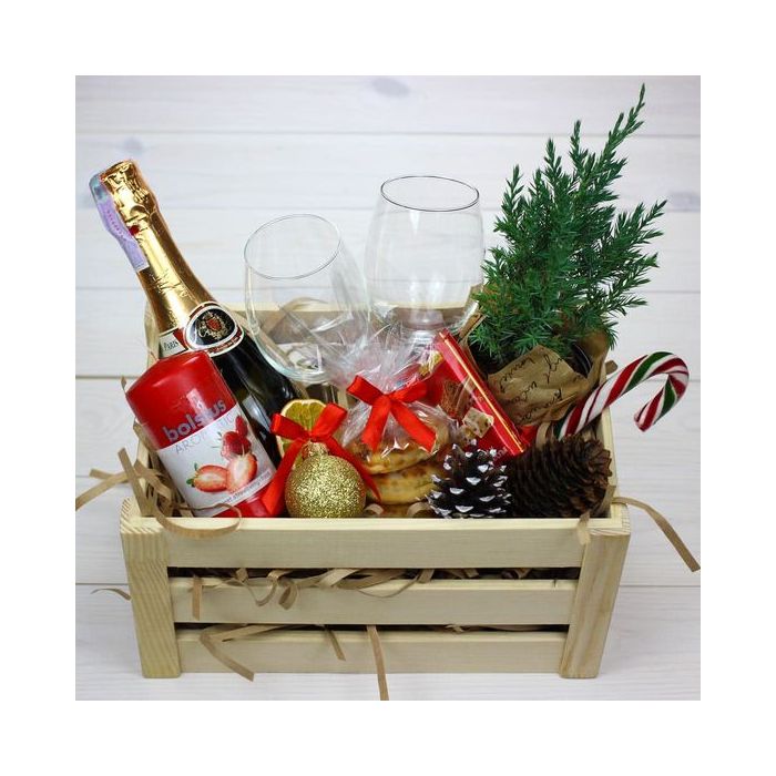 Композиція складається з шампанського, келихів для шампанського, імбирних пряників, традиційної новорічної карамелі та шоколаду, який оцінять усі любителі солодкої, а також кімнатної рослини, так вдало схожої на новорічну ялинку. Презент виконаний із найкращих декоративних матеріалів. Композиція наповнена шишками, які додадуть затишку та казкової атмосфери під Новий рік.