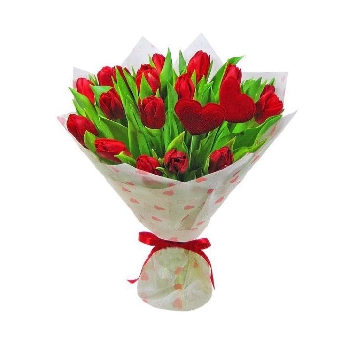 тюльпаны - 19 шт., декоративные сердца - 2 шт., оформление.
