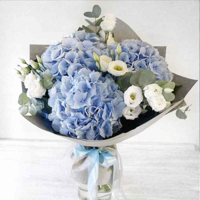 Опис / Букет 3 блакитних гортензії та еустому "Літня мелодія"