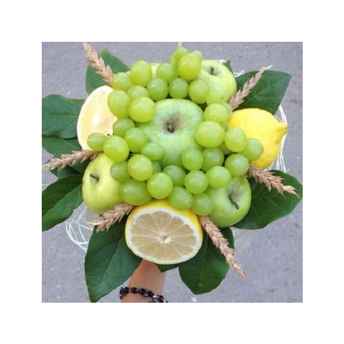 Фруктові букети - це актуальна тенденція флористики, яка впевнено завойовує серця і поступово стає одним із справжніх хітів. Композиція із солодких яблук, цукрового та соковитого винограду, пікантних кисленьких лимонів – це вітамінний "бум", який виявиться не просто красивим презентом, а й цілком корисним. Для створення букету ми використовуємо свіжі плоди.
