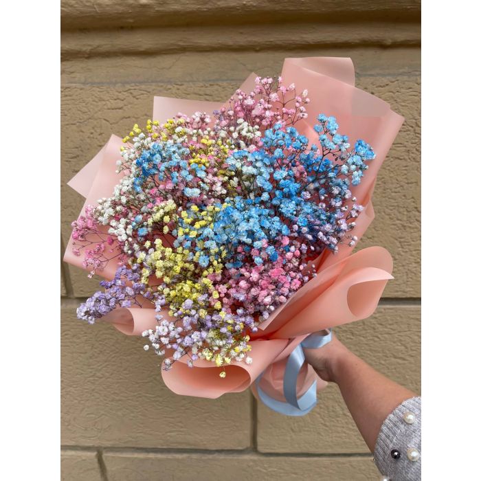 Невеликий букет із різнокольорових гіпсофіл - це відмінний подарунок для яскравих людей. Завдяки сучасним флористичним барвникам споконвічно біла в природі гіпсофіла набуває зараз будь-яких розмальовок: від ніжних нюдових відтінків до глибоких темних тонів. Такі барвники зовсім не шкодять квітці, а тому різнокольорова гіпсофіла, як і її білий різновид, відмінно стоїть, майже не вимагають особливого догляду, перетворюючись згодом на чудовий стильний сухоцвіт.