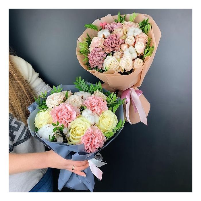 Що може бути нижчим поєднанням білосніжного хлопка, роз та чарівних гвоздик? Нежного як зефір, який став символом романтики. Композиції дуже оригінальні і дозволяють справді вразити уяву одержувача. Вони принесуть не тільки щастя від факту Вашої уваги, а й справді естетичне насолоду одержувачу. Це подарунок, яким можна і потрібно милуватися та по-доброму хвалитися.