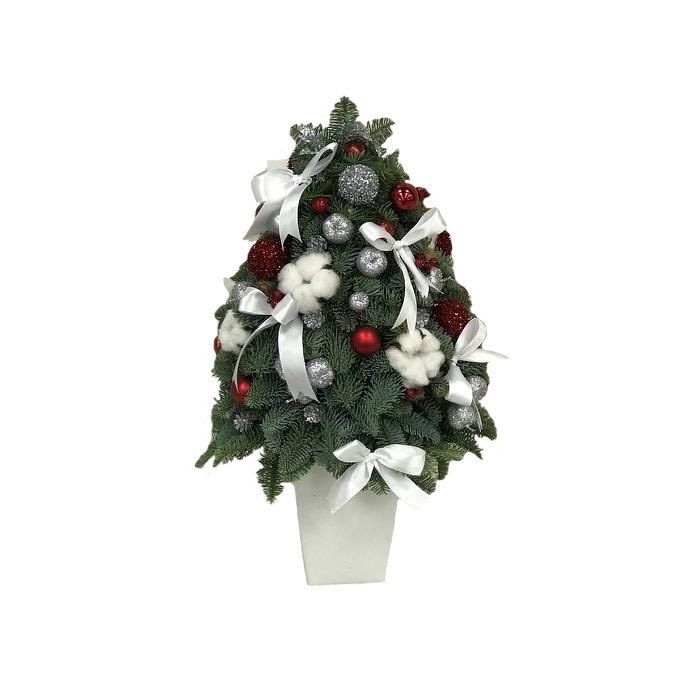 Декор витриманий у стриманій кольоровій гамі: традиційні червоні новорічні кулі разом із білими стрічками та сріблястими прикрасами. Доповнити композицію можна коробкою з солодощами, листівкою, м'якою іграшкою, фруктовим кошиком. У нас можна купити новорічні та різдвяні композиції недорого. Виконуємо доставку замовлень у Харкові, кур'єри привозять квіти та подарунки цілодобово.