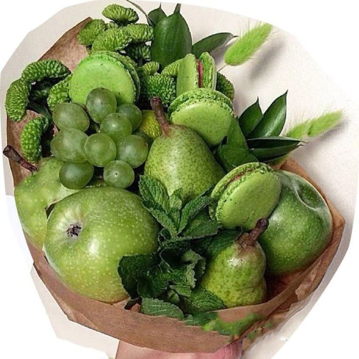 У складі дивовижної композиції ви знайдете неймовірний вітамінний мікс. Це солодкі груші яблука, кислий та пікантний лайм, виноград, найніжніші французькі тістечка, а доповнює композицію зелень. В результаті виходить чудовий зелений букет, який буде не тільки стильно виглядати, але й принесе чималу користь тому, хто поласує свіжими плодами. Сміливо обирайте такий подарунок вашим близьким, незалежно від приводу та майбутнього свята.